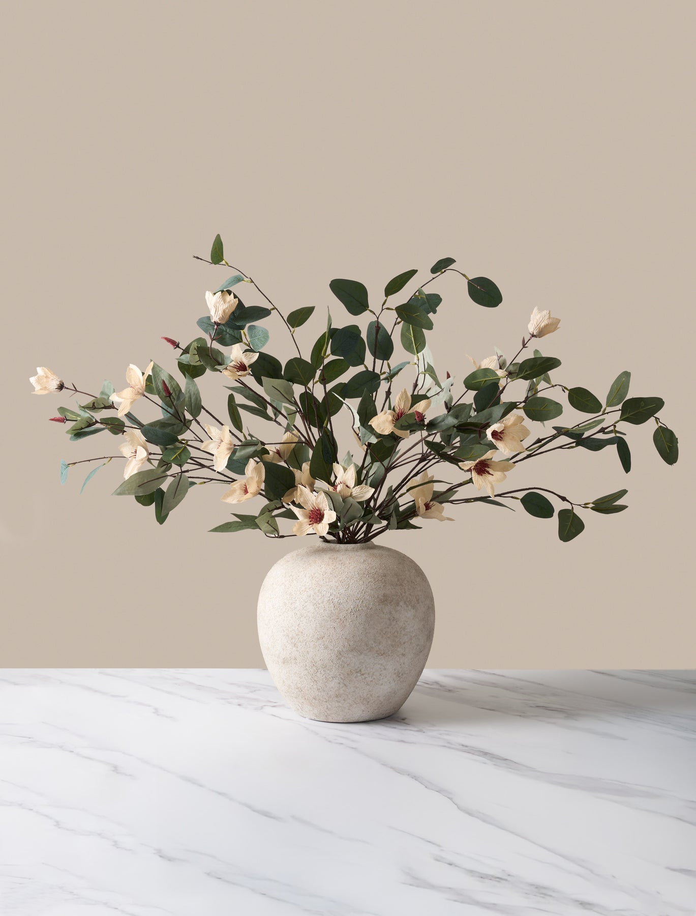 Cream magnolia flowers and fresh eucalyptus foliage come together in this soft, soothing faux arrangement. If you’re updating your space and want something that feels gentle, neutral and chic, this is the arrangement for you. A classic design made to lift every room.