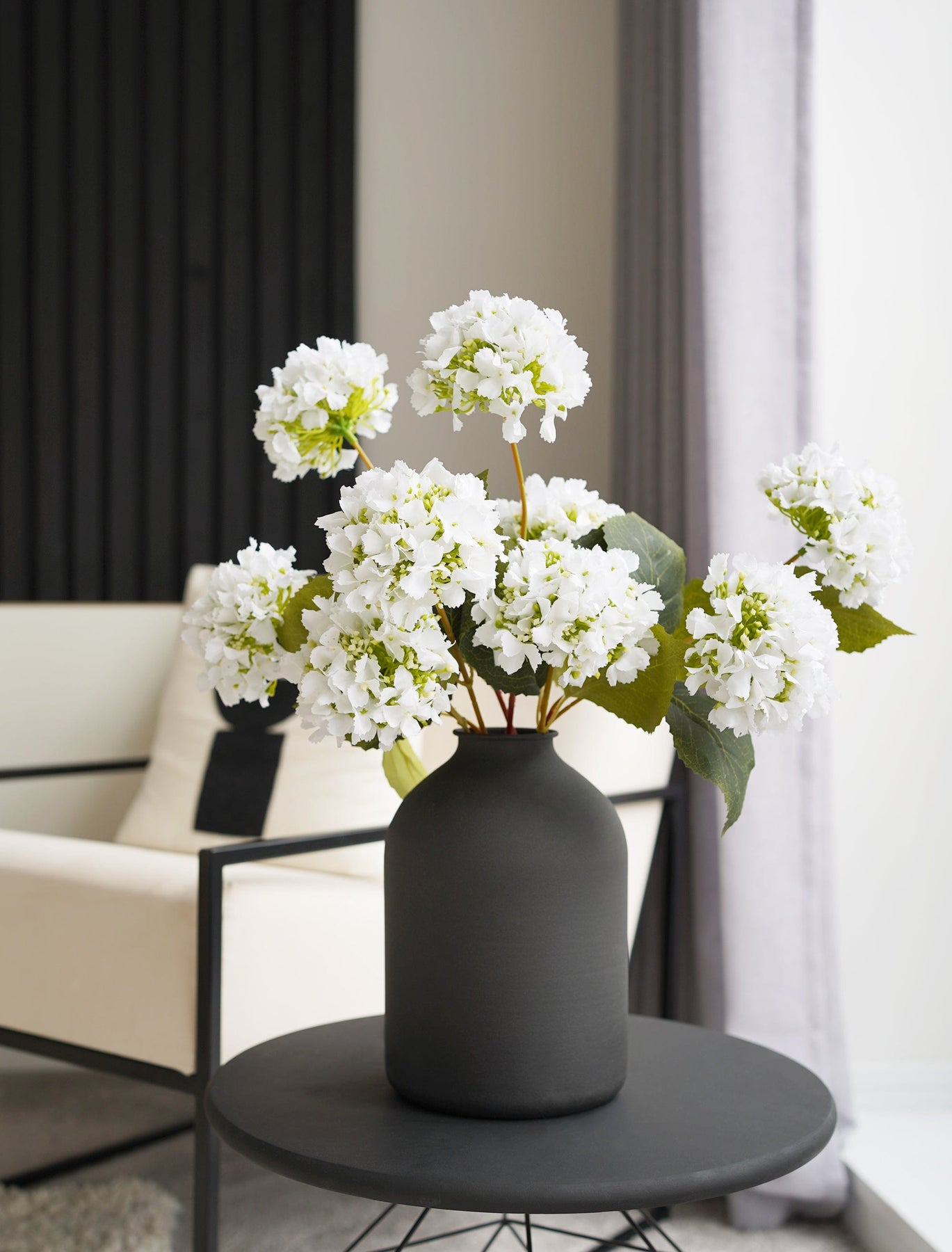 We recommend pairing this Faux Hydrangea bunch with our Black or White Arlo Vase as pictured.