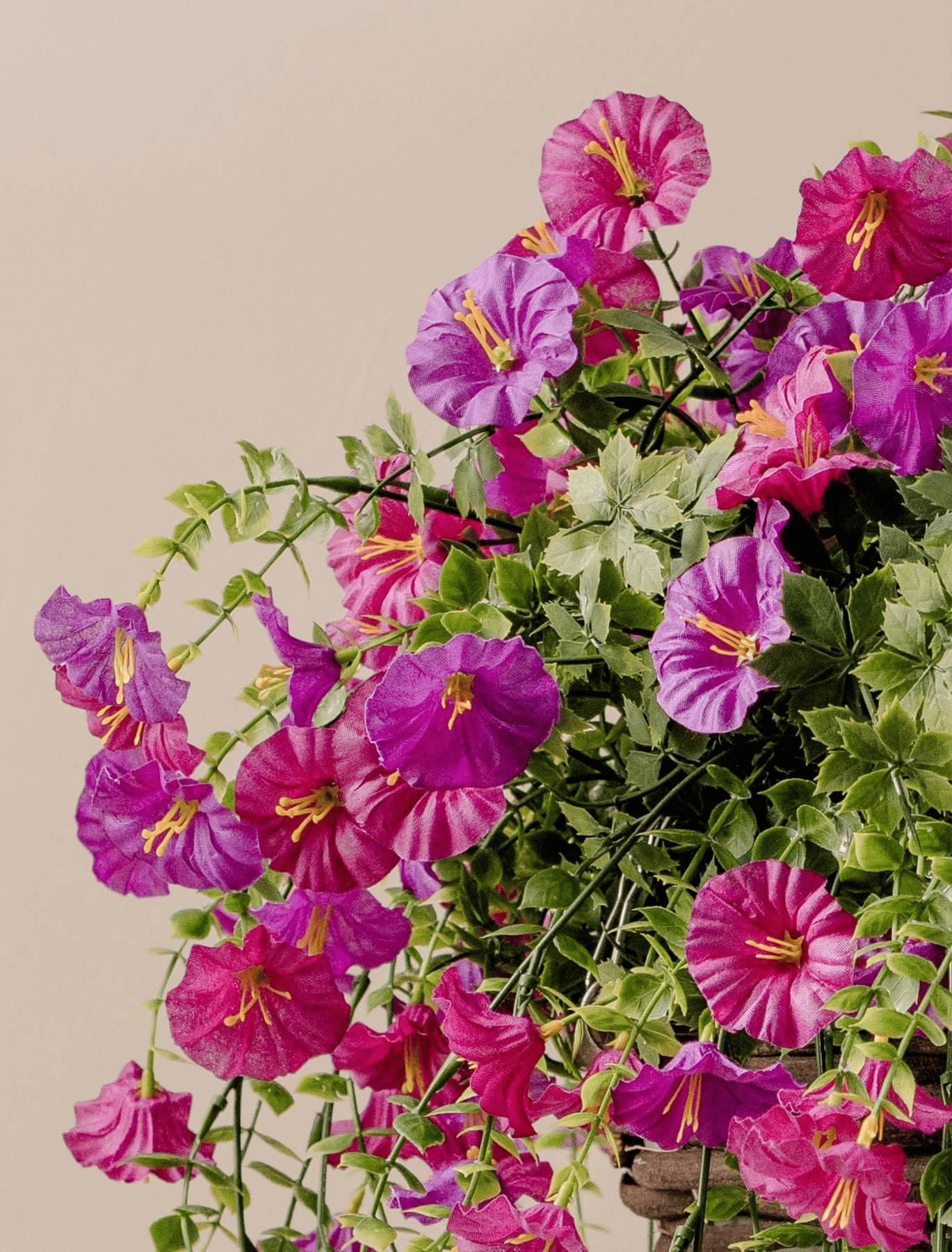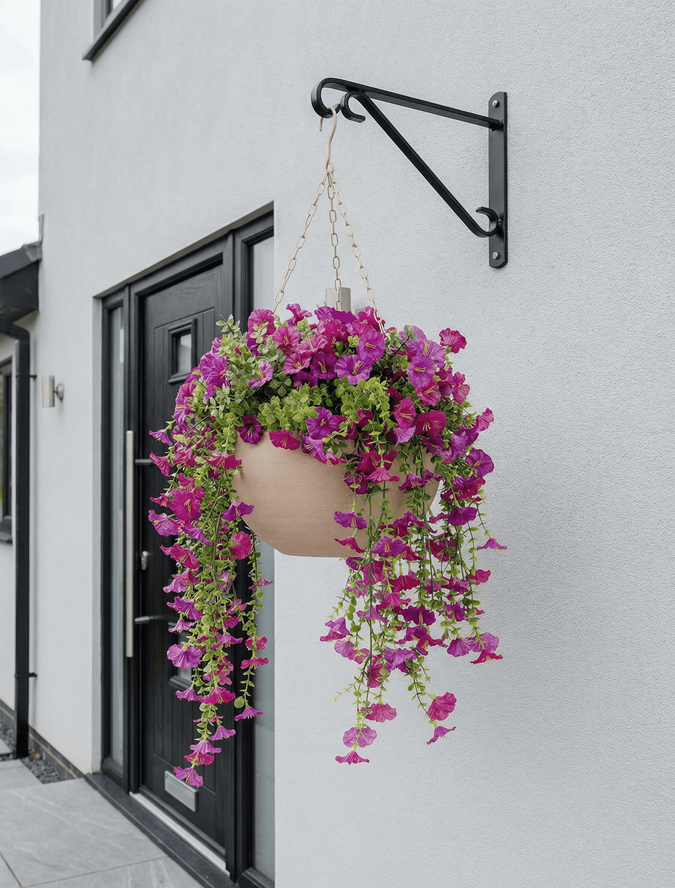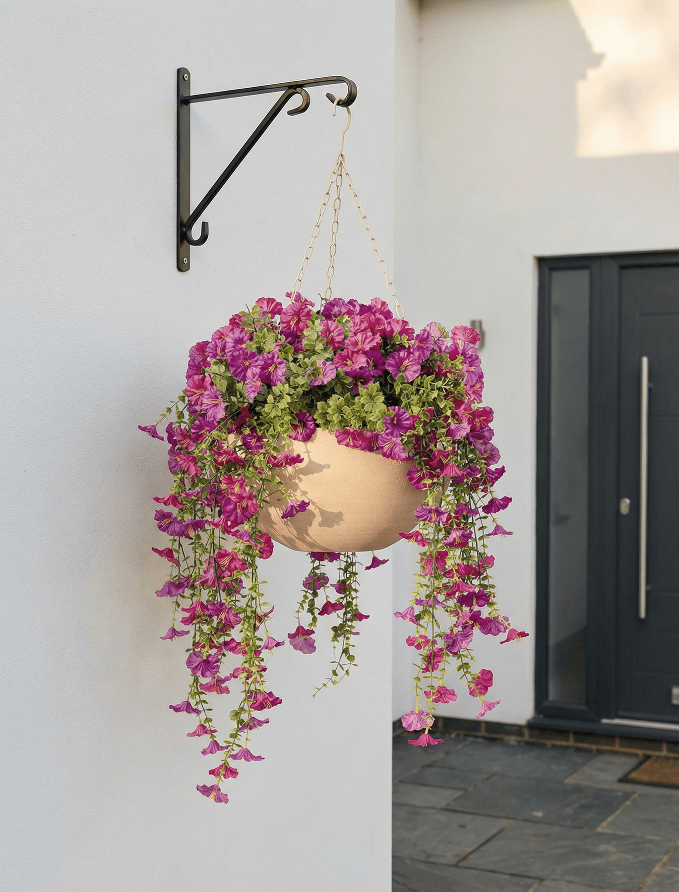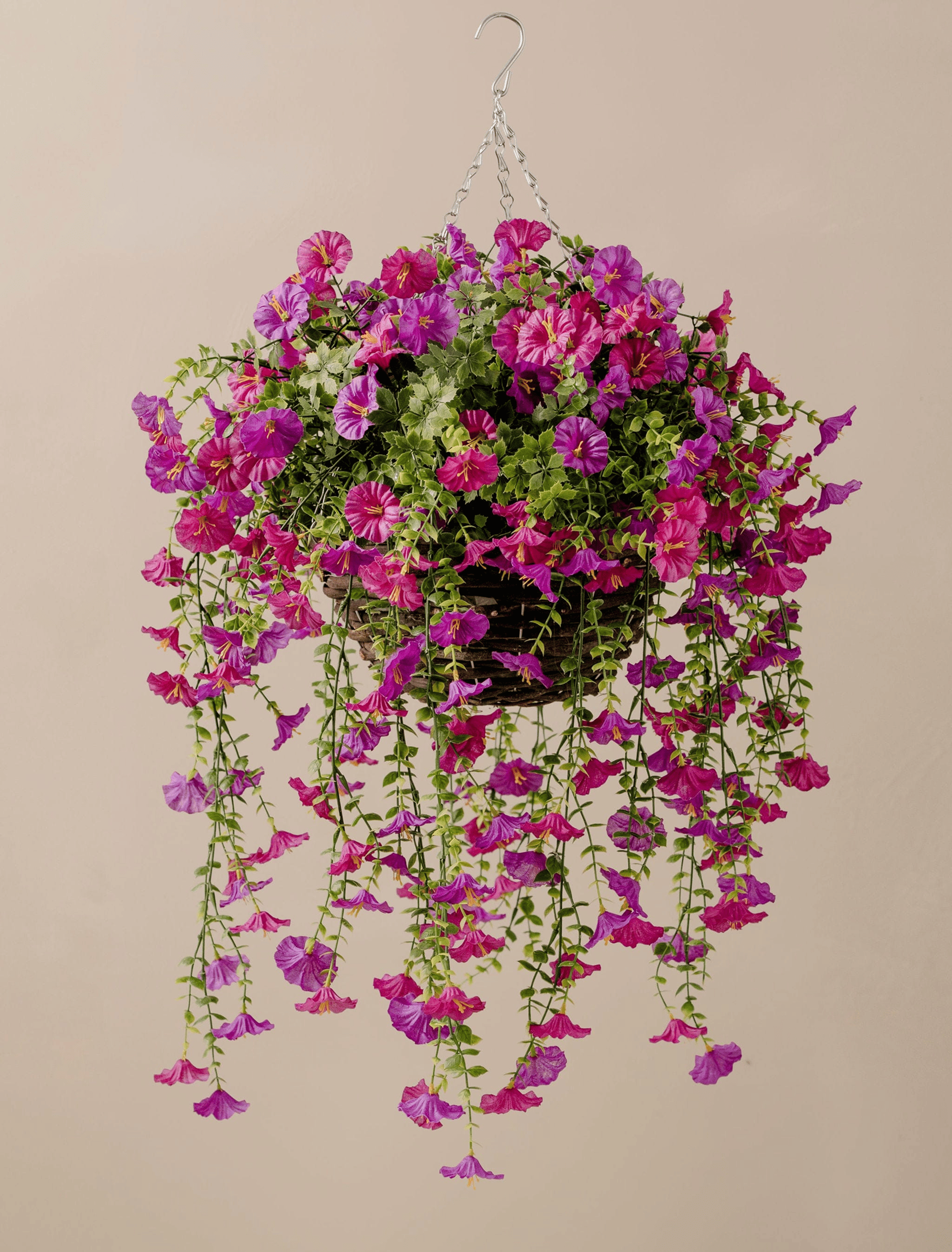 A vibrant hanging basket filled with rich purple petunias and fresh green foliage. Perfect for adding colour and impact to entrances, patios or garden walls without the upkeep of live plants.